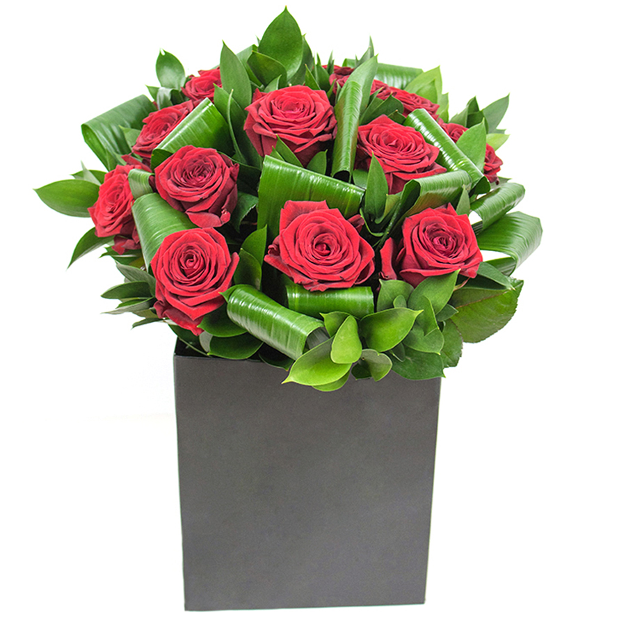 Embrace the beauty of nature with our meticulously crafted bouquet featuring rich red roses, complemented by striking aspidistra leaves and subtle ruscus. Designed with care, this arrangement exudes warmth and elegance and is perfect for any setting. Every flower is expertly hand-selected for peak freshness and exceptional quality.