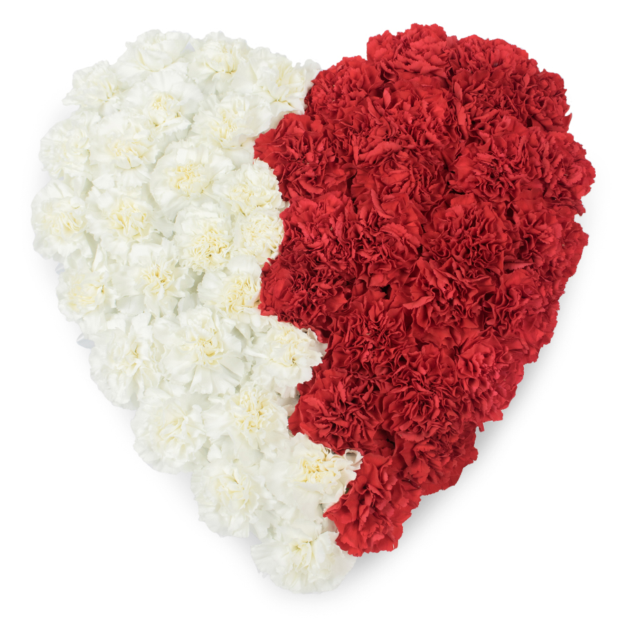Introducing our sophisticated heart-shaped bouquet, featuring a vibrant mix of white and red carnations. Each flower is hand-selected to ensure the highest level of freshness and quality.