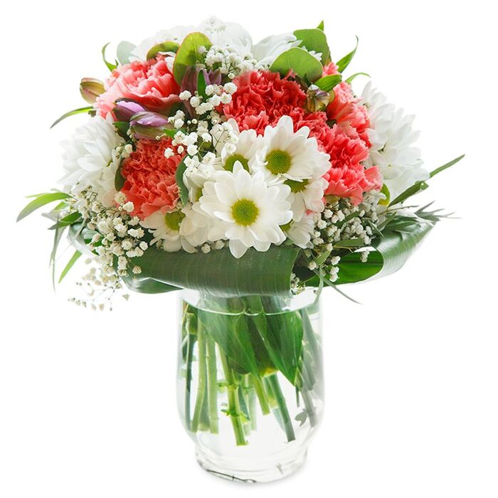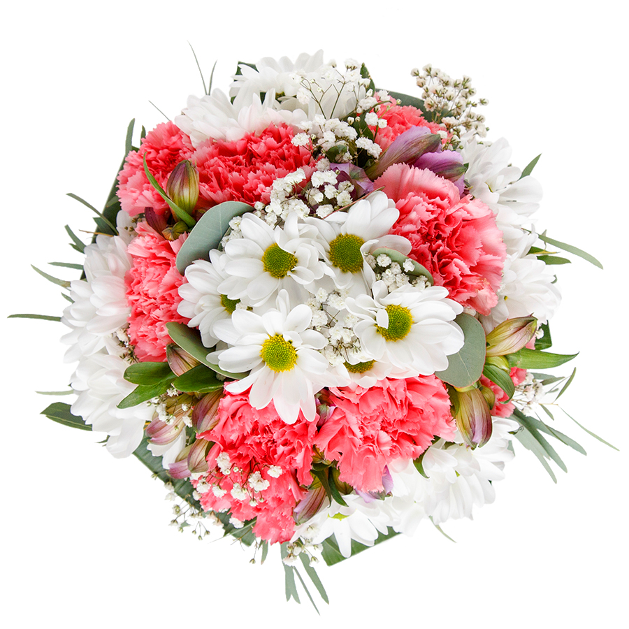 Express your sentiments with our graceful and unique flower arrangement. This bouquet combines snow-white chrysanthemums, airy gypsophila, and light pink carnations, artfully arranged with lush aspidistra leaves. Each flower is hand-selected to ensure maximum freshness and beauty.